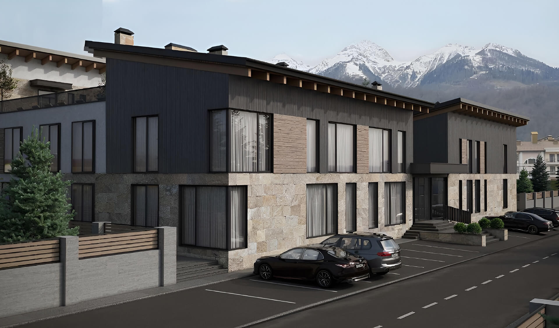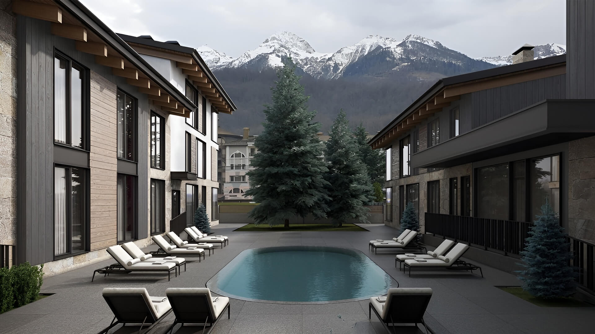 В комплексе предусмотрены крытый и открытый бассейны с подогревом, позволяющие наслаждаться плаванием круглый год. SPA & Wellness центр включает хаммам, финскую сауну и массажные кабинеты. Для занятий спортом оборудован современный фитнес-зал. На территории есть просторная лаунж-зона с панорамными видами на горные вершины, а также ski-room для удобного хранения спортивного инвентаря. Для автовладельцев предусмотрена охраняемая парковка.